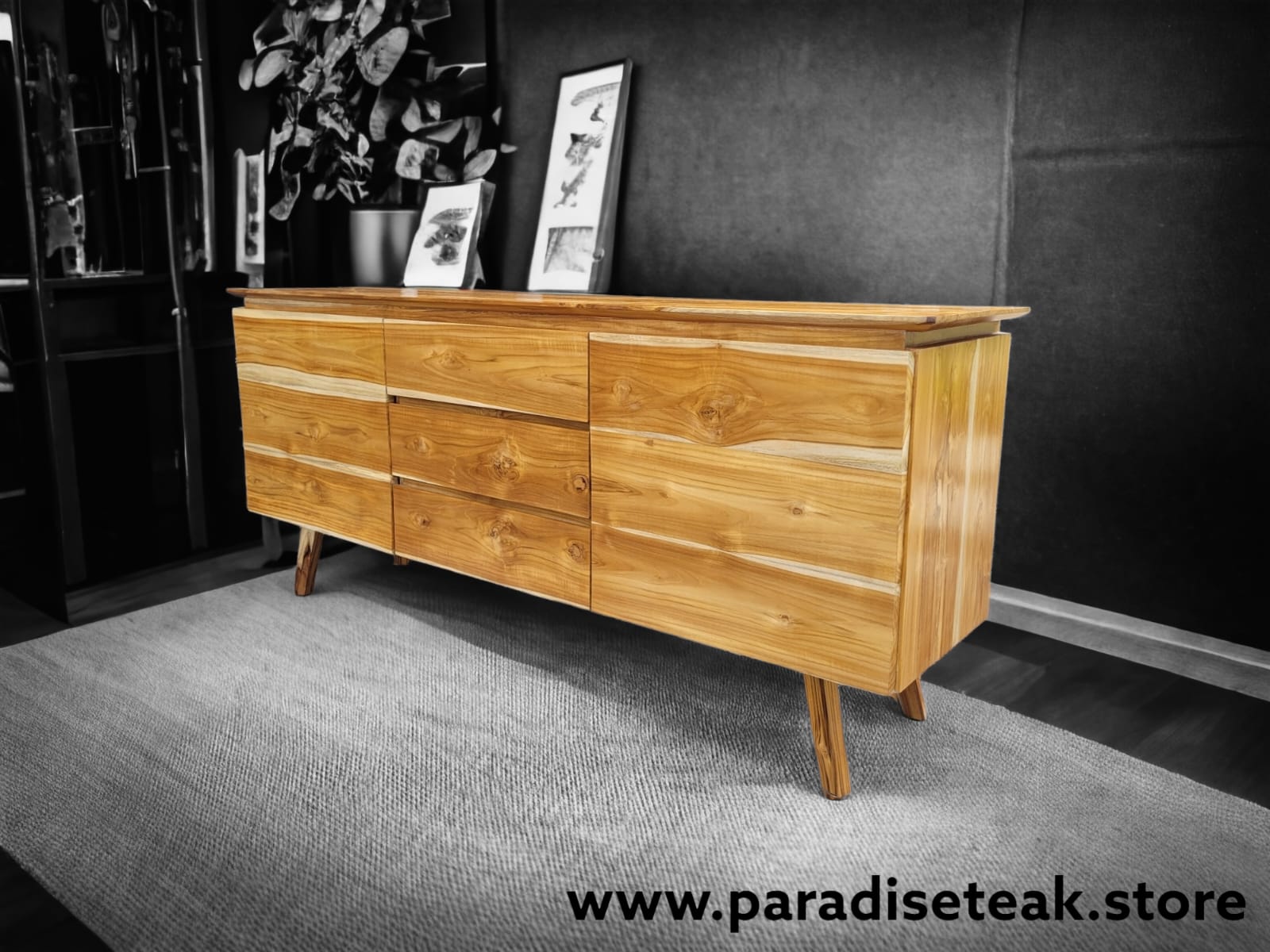 El acabado natural de la teca se complementa perfectamente con el diseño Mid-Century: tonos cálidos, vetas elegantes y superficies lisas.